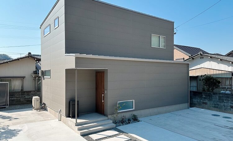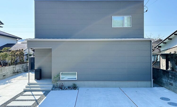 軒ゼロ、緩い勾配屋根(ガルバリウム鋼板立平嵌合)、正面から見える窓を減らし、ポーチを欠ぐことで四角いシンプルな外観にしました。外観をシンプルにすると、小さなロックガーデンや宅配ボックスも引き立つ効果があります。