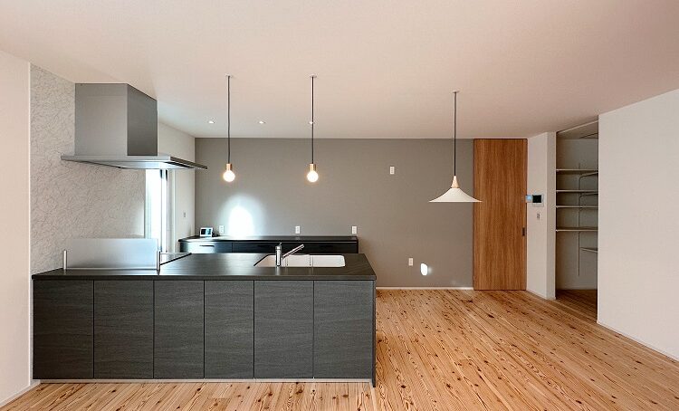 キッチンにダイニングやパントリーが隣接するので、家事が楽な動線です。キッチン背面は勝手口があり、ゴミ出しがしやすい設計です。