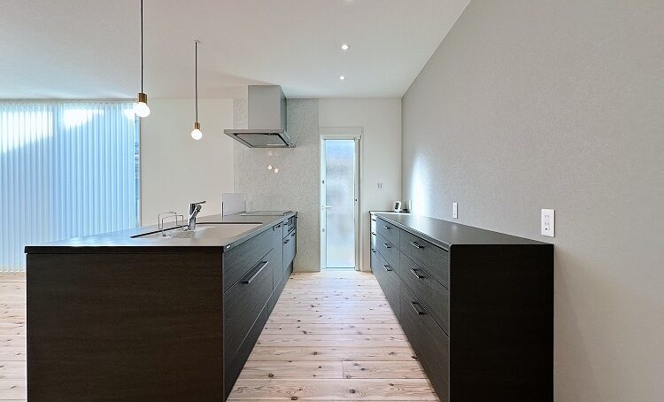 吊戸棚がないので、キッチンまわりが開放的です。勝手口ドアからも採光を確保し、キッチンが明るくなるようにしました。キッチン背面のみグレーの壁紙を張り、アクセントにしました。