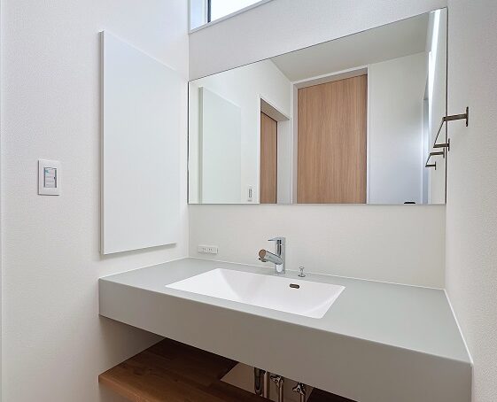 造作と既製品を組合せた洗面化粧台です。間口の広い壁一面の鏡は朝の混雑を解消できます。壁面ニッチ収納、下部カウンターは隠す収納ができ、使いやすいです。上部の横長の窓は天井付けで明るく、隣地からの視線が気になりません。