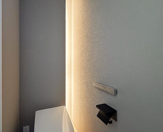 トイレの照明は奥の壁からの間接照明にしました。陰影のある落ち着いた空間を演出しました。