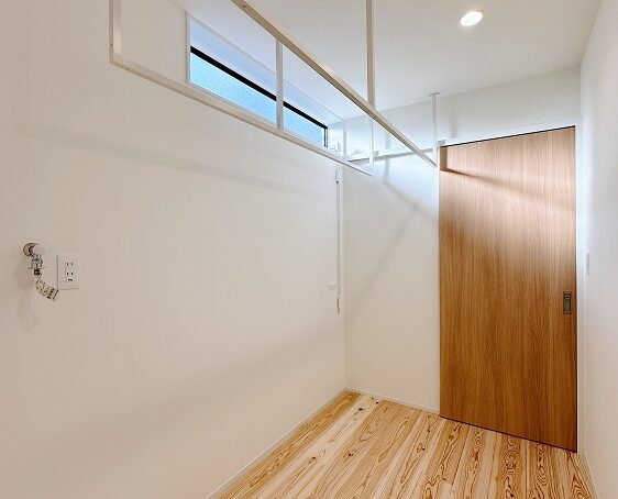 洗面と浴室の間に設けた脱衣室には部屋干しができるよう、ランドリーパイプを取付けました。窓は横長で天井付けにし、隣地からの視線に配慮しました。