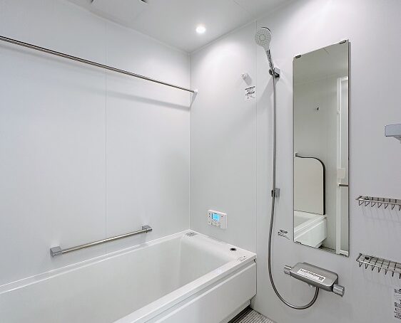 シンプルな白い壁面のシステムバス。マグネットがくっつくのでレイアウト変更でき、使いやすいです。