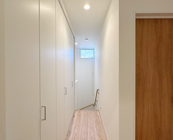 2階廊下が暗くならないよう、階段室の上部(天井と壁の角)に窓を設け、奥まで明りが届くようにしました。