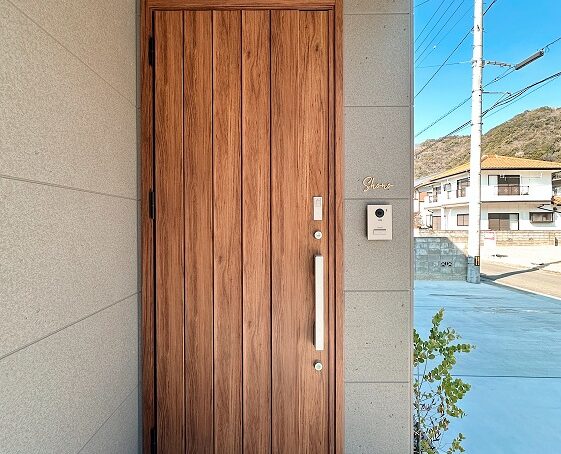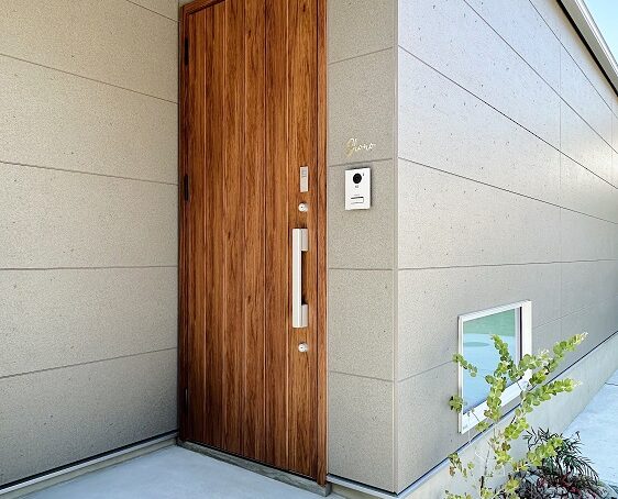外壁パネルのコーナー役物を使用せず、余分な目地を減らしました。玄関ドアや表札まわりをスッキリ収めるよう工夫しました。ポーチ軒天井にセンサー付きダウンライトを設け、防犯性にも配慮しました。