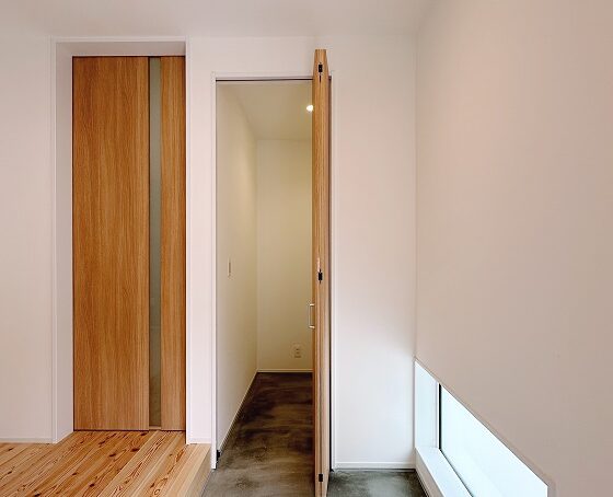ポーチから連続する玄関土間はモルタル仕上げです。奥に土間収納を設け、趣味のスノーボード・アウトドア用品等を収納できるようにしました。