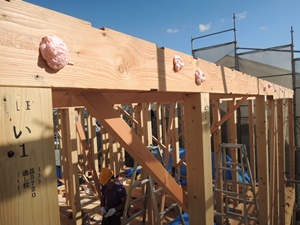 それからまた2Fの管柱、梁、小屋束、母屋と建てていきます。